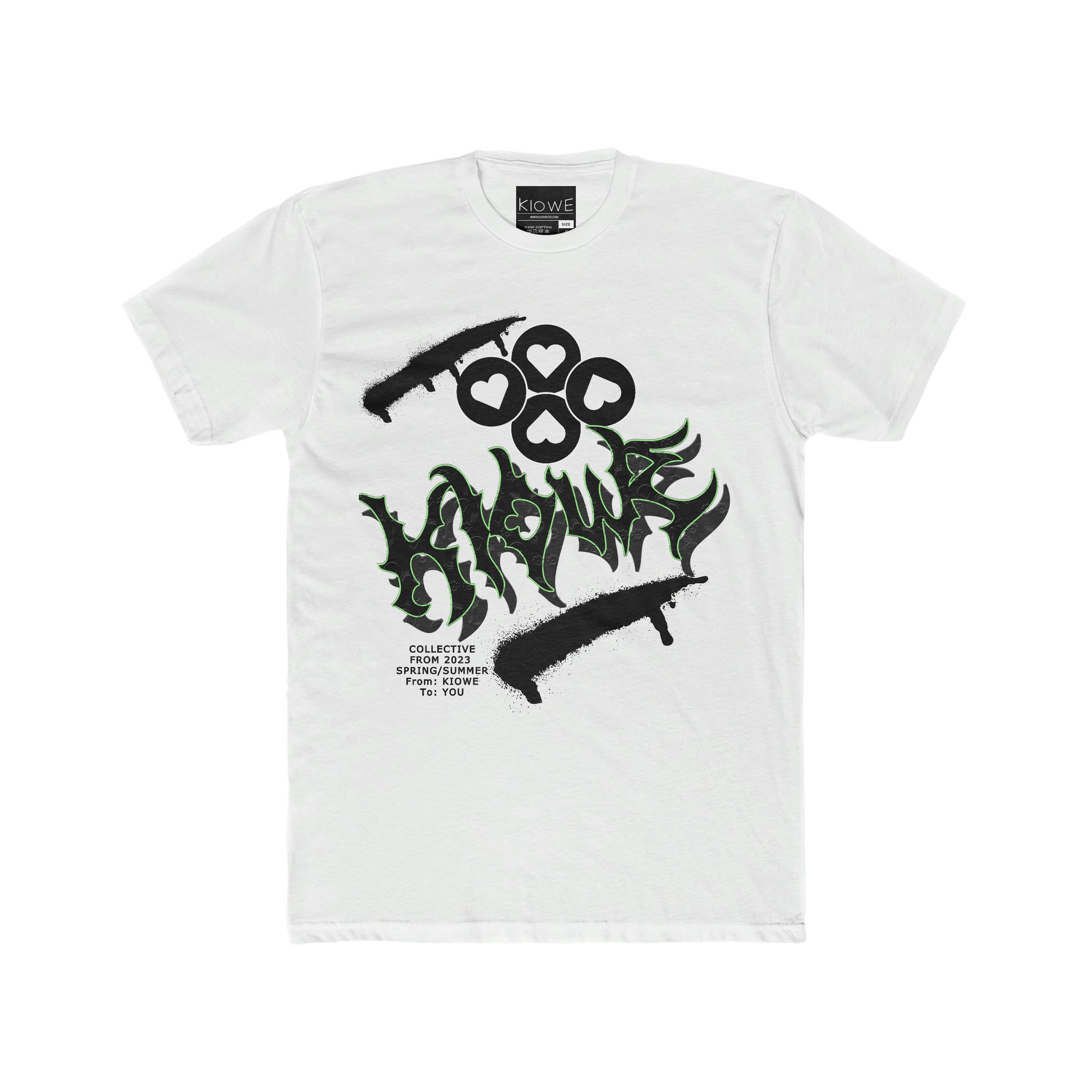 Graffiti heart printed shirt with monogram embossed Kiowe logo, green outlined for vibrance.