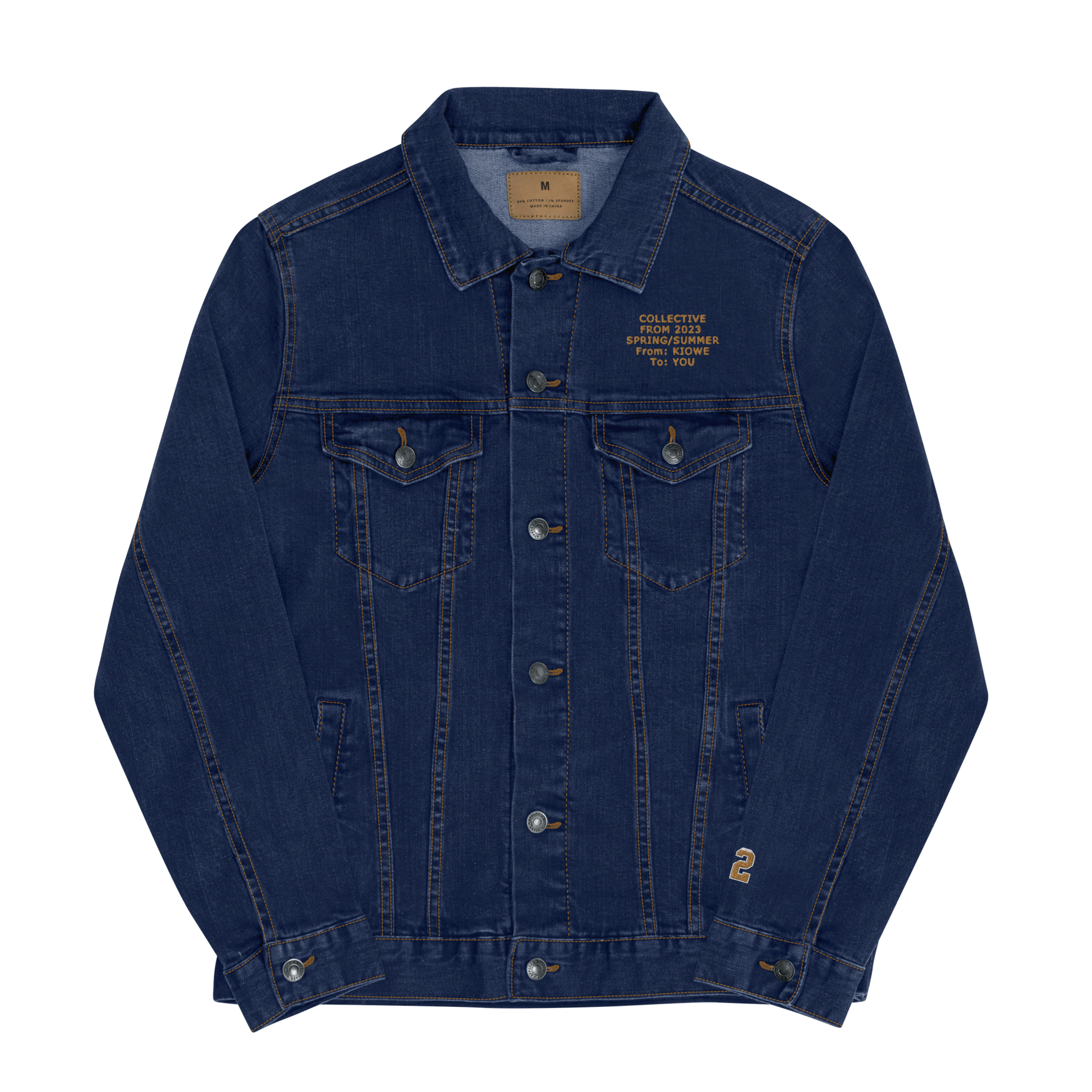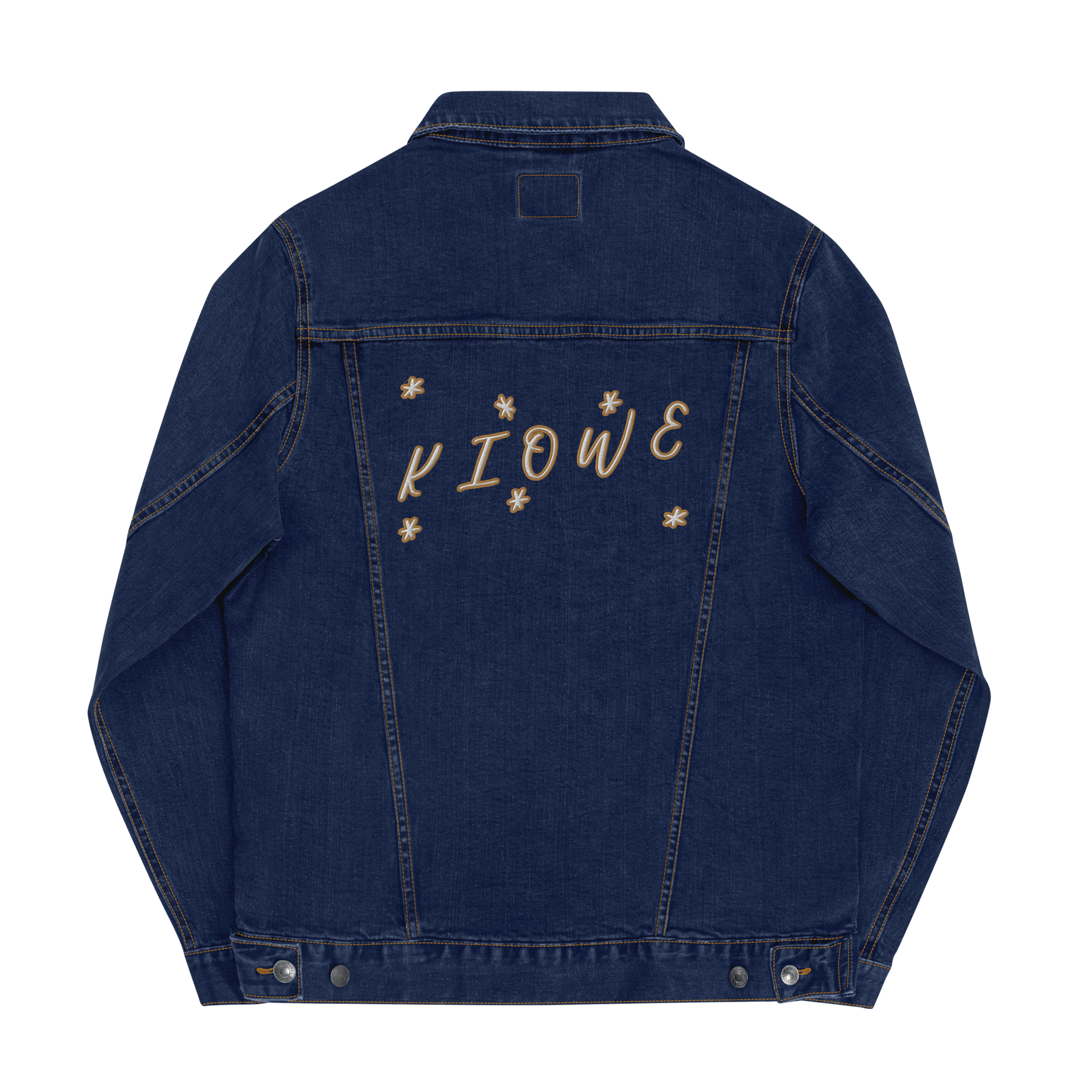 This is a collective from our 2023 spring/summer. Denim forged with gold and white Kiowe design on the back and a gold 22 on the bottom left sleeve.